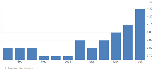 The labor market was noticeably softer in July and unemployment numbers have been trending higher for most of the past six months. Nonfarm payrolls rose 114,000, lagging the consensus expected 175,000 in the most recent July report, while payroll gains for prior months were revised down by 29,000. Now at 4.3%, unemployment levels are nearing a point where the U.S. may soon find itself in recession. Key details in the report were also concerning. Total hours worked declined 0.3% in July and hourly wages are now up only 3.6% from a year ago, which is barely above inflation.