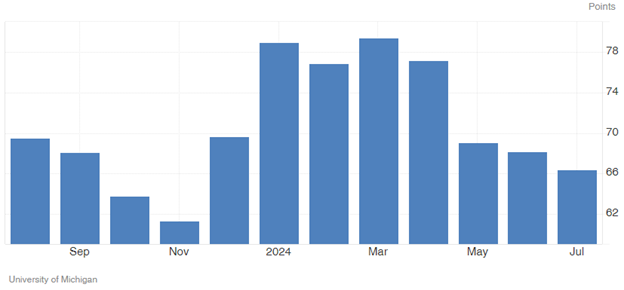 The University of Michigan consumer sentiment for the U.S. came in at 66.4 in July 2024, marking a new eight month low. Sentiment remains guarded as high prices continue to drag down attitudes, particularly for those with lower incomes.